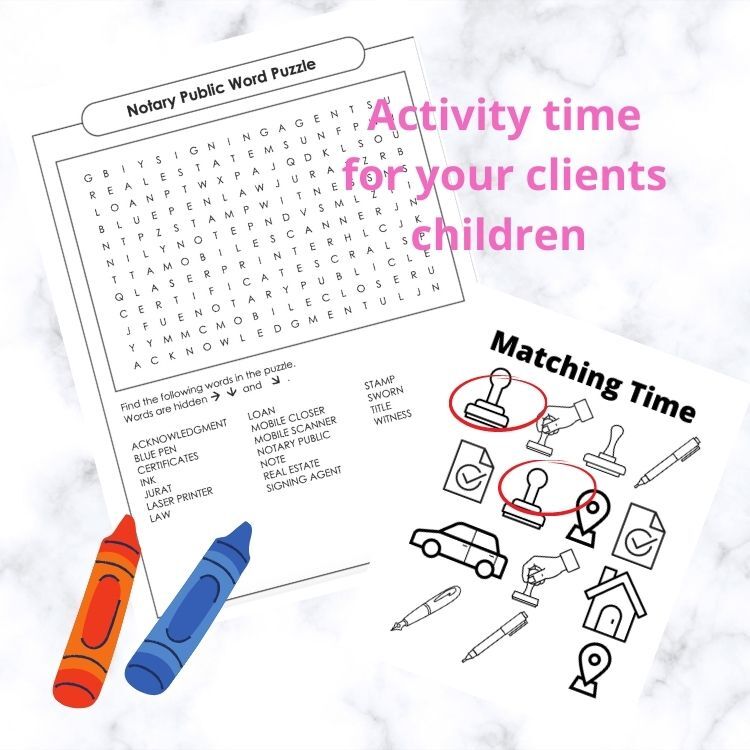 Take This Fun Notary Public Activity Book with you! keep the kids busy with Coloring, Matching and Cross Word Puzzles. If you are a parent then you know how important it is to keep your child busy especially during a important appointment. During your Loan Signing appointments it is extremely important to have your clients full attention, executed documents correctly and show great customer service. Handing an Activity Book with crayons will not only make the appointment go smooth but you will be their #1 Notary! So Get Ready for Business!!! Print this PDF at home and buy some crayons and off you go to make an impact!!!
